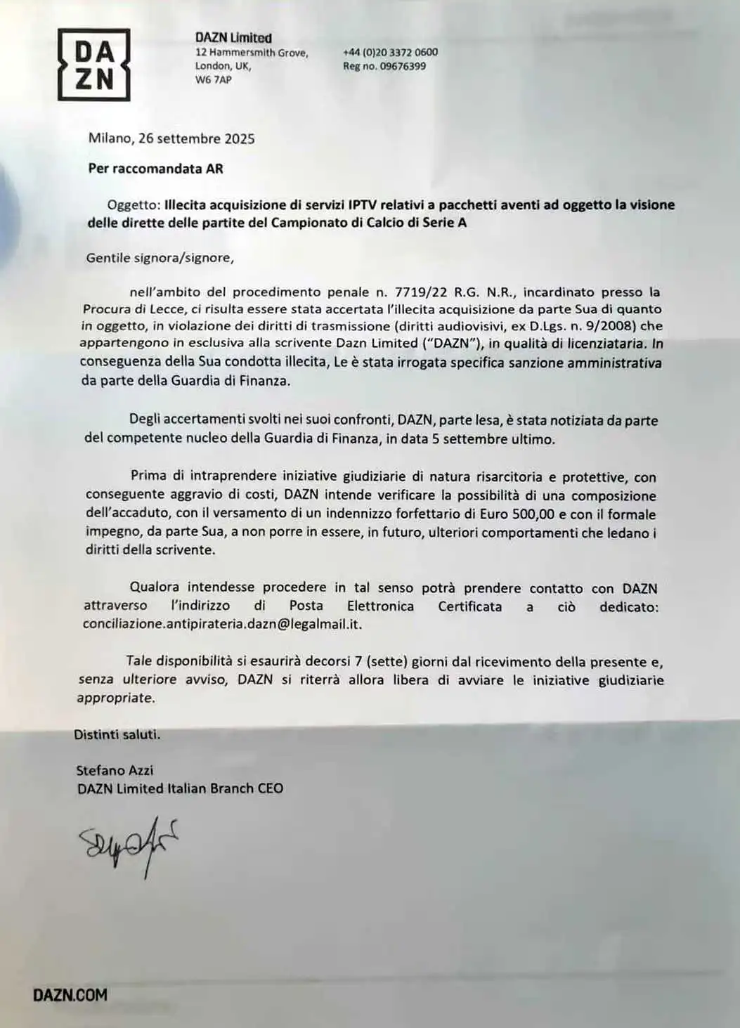 La Lettera di Risarcimento Danni DAZN - La mossa più concreta e immediata è arrivata da DAZN, che ha inviato circa duemila lettere agli utenti sanzionati. Il testo della comunicazione (relativa al procedimento penale n. 7719/22 R.G. N.R.) accerta l'illecita acquisizione dei servizi IPTV, specificatamente riguardanti la visione delle partite del Campionato di Calcio di Serie A. Tuttavia, prima di procedere con onerose iniziative giudiziarie di natura risarcitoria, DAZN ha offerto una via di compensazione extragiudiziale: un indennizzo forfettario di 500 euro.